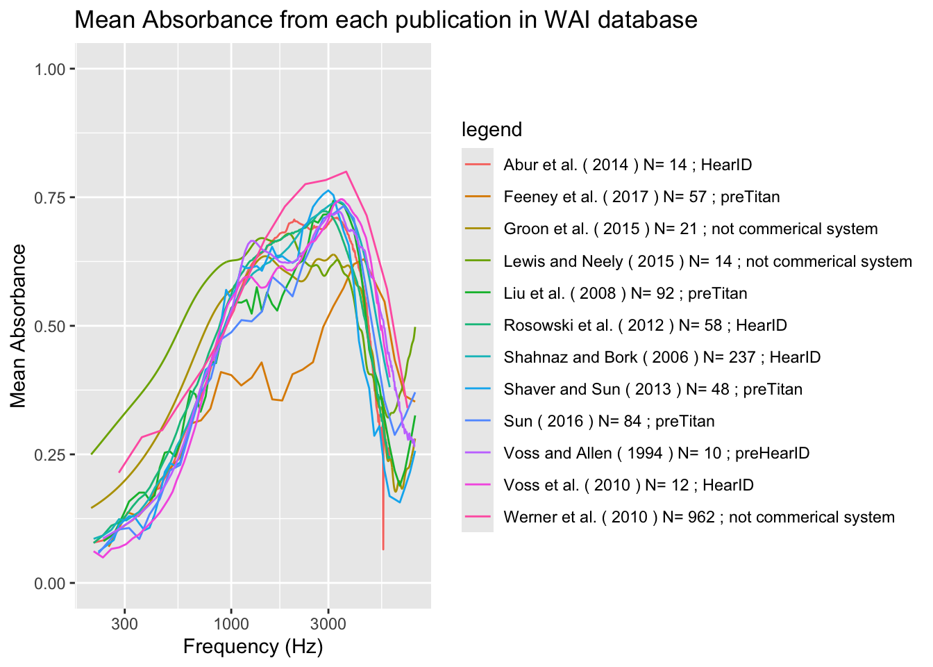 The graph above is a recreation (for the most part) of the Figure 1 plot I intended to copy. There are one or two datasets that are different from the original study, thus a perfect representation is most likely not possible using the data provided. This depicts the relationship between the mean absorbance (scaled from 0-1) and the frequency (with a range of 200-8000 Hz) based on a combination of variables. The legend explains the different lines of the graph, based on author, year, instrument used to conduct the experiment, and the number of “unique ears.” The peak is around 3000 Hz for most of the cases in the legend.