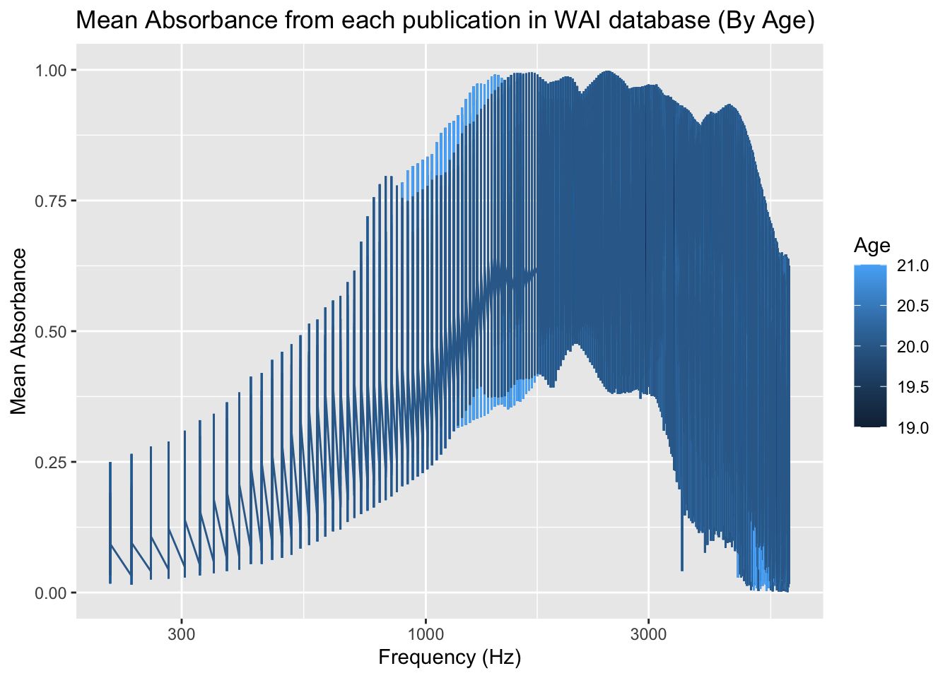The above graph is very similar to the one already shown. The only difference for this specific plot is that the relationship between the mean absorbance (scaled from 0-1) and frequency (with a range of 200-8000 Hz) is based on the age of participants. The ages range from 19-21, including differences in ages based on half a year (i.e. 19.5, 20.5). Unlike the previous plot, there is no obvious peak, but rather an area (between 1000-6000 Hz) for the approximate max absorbance. There appears to not be a strong relationship based on the age; however, due to the difference being only two years, this would most likely have more significant results as the ages continue to increase. Note that the graph, although mostly accurate, is limited due to the restriction of the data to 100,000 in order for my computer to cooperate. With the full data, the graph may change slightly.